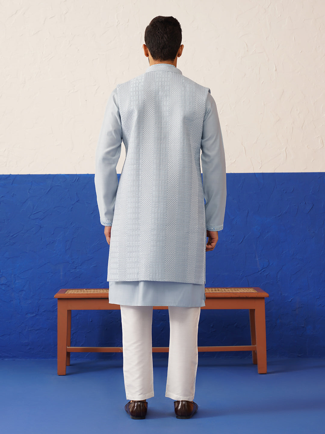 Aqua Blue Computer Emb Long Bundi Kurta Set