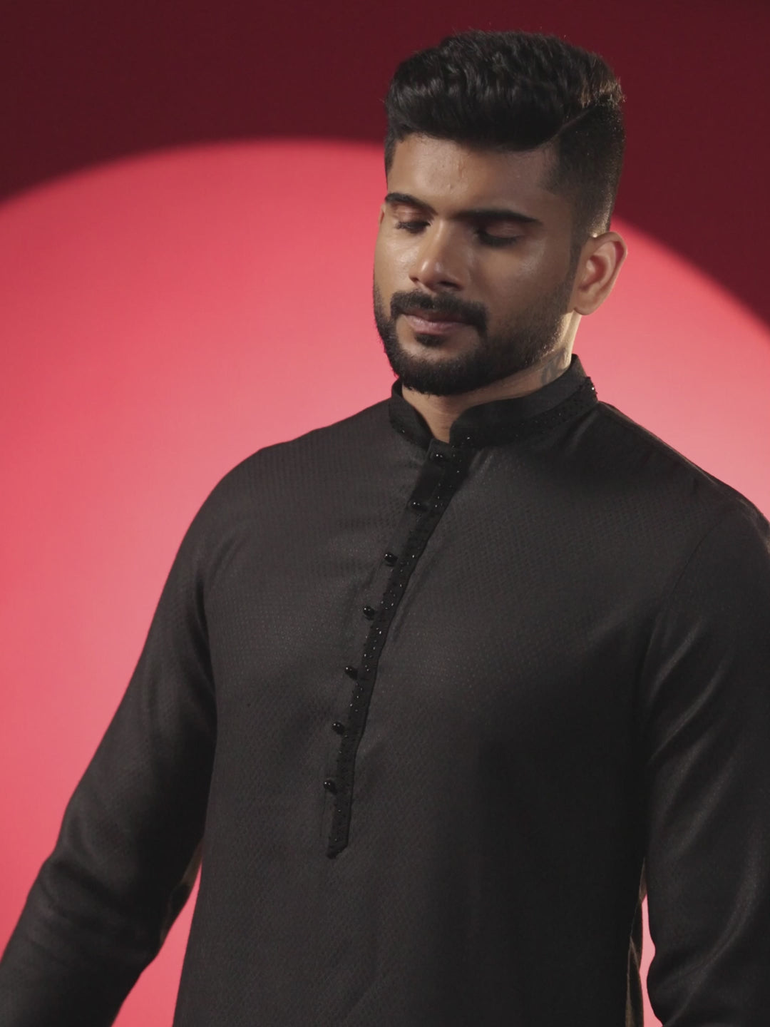 This Black Cotton Kurta Set from The Ethnic Co is the perfect choice for an elegant look. Crafted from black cotton and featuring subtle embroidered detailing, this classic kurta pajama set will surely be the highlight of any wardrobe. With its black on black design, this classic kurta set exudes a timeless and sophisticated style.