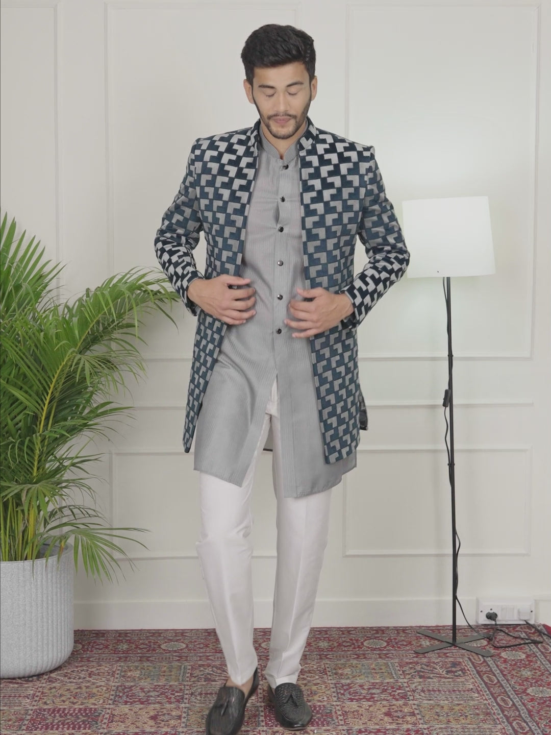Expertly crafted with luxurious grey navy velvet, this Indowestern outfit from theethnic.co exudes elegance and sophistication. The perfect fusion of traditional and contemporary fashion, it is designed to make a statement at any special occasion. With its impeccable quality and timeless style, this outfit is a must-have for any fashion-forward individual.