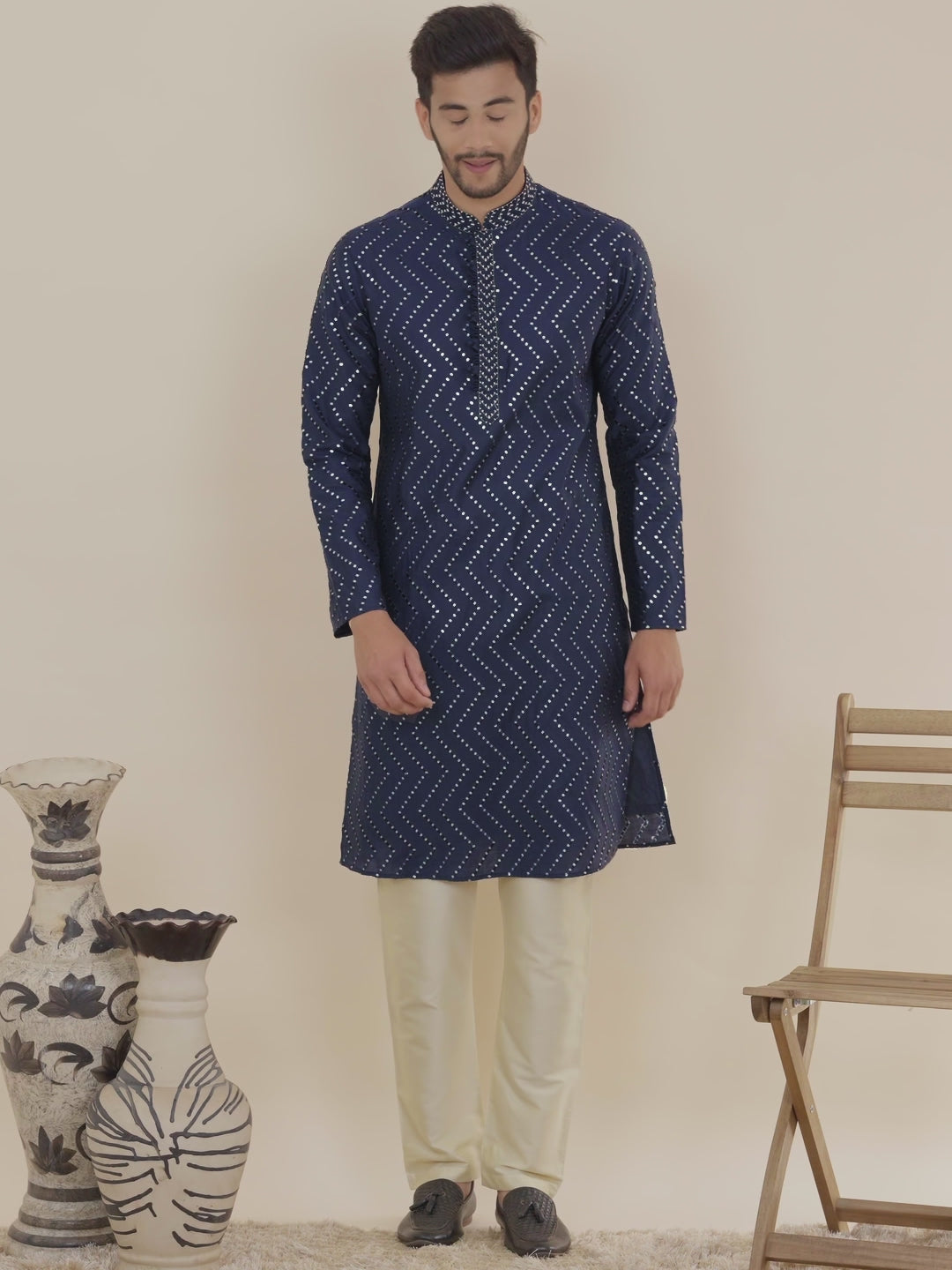 This Navy Zigzag Embroidered Kurta Set by TheEthnic.Co combines traditional Indian design with contemporary style. Made of high-quality fabric, it features intricate zigzag embroidery for a unique and sophisticated look. Elevate your wardrobe with this versatile and elegant kurta set.