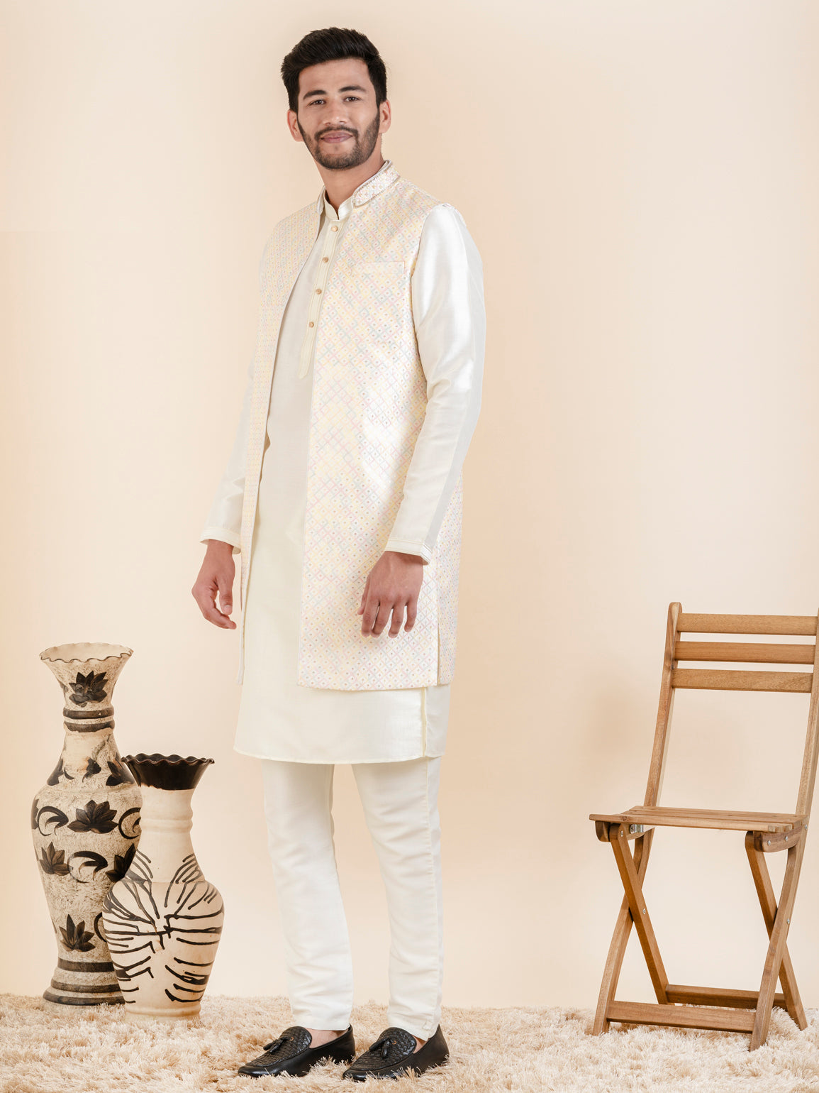 This Off White Embroidered Bundi With Kurta Set by TheEthnic.Co features exquisite embroidery that adds a touch of elegance to any occasion. The high-quality material ensures comfort and durability, making it a perfect choice for any formal event. Elevate your style with this versatile set.