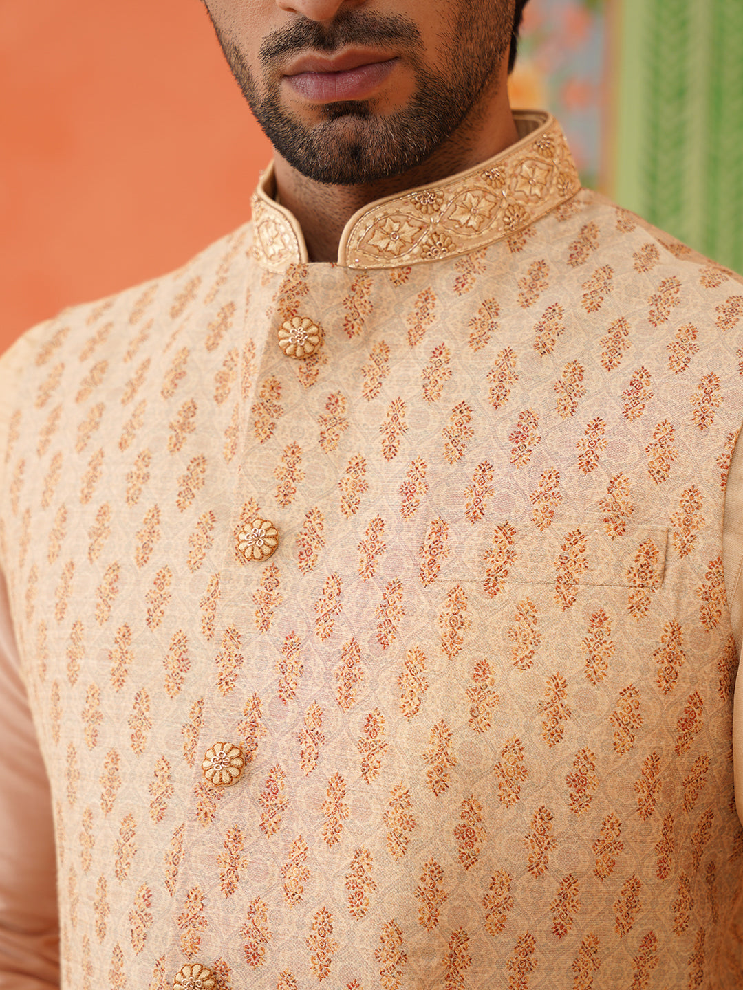 Enhance your wardrobe with our Peach Jacquard printed Jacket kurta Set. The intricate jacquard print adds a touch of elegance to this set, making it perfect for any formal occasion. Made with high-quality materials, this set offers both comfort and style, making it a must-have for any fashion-forward individual.