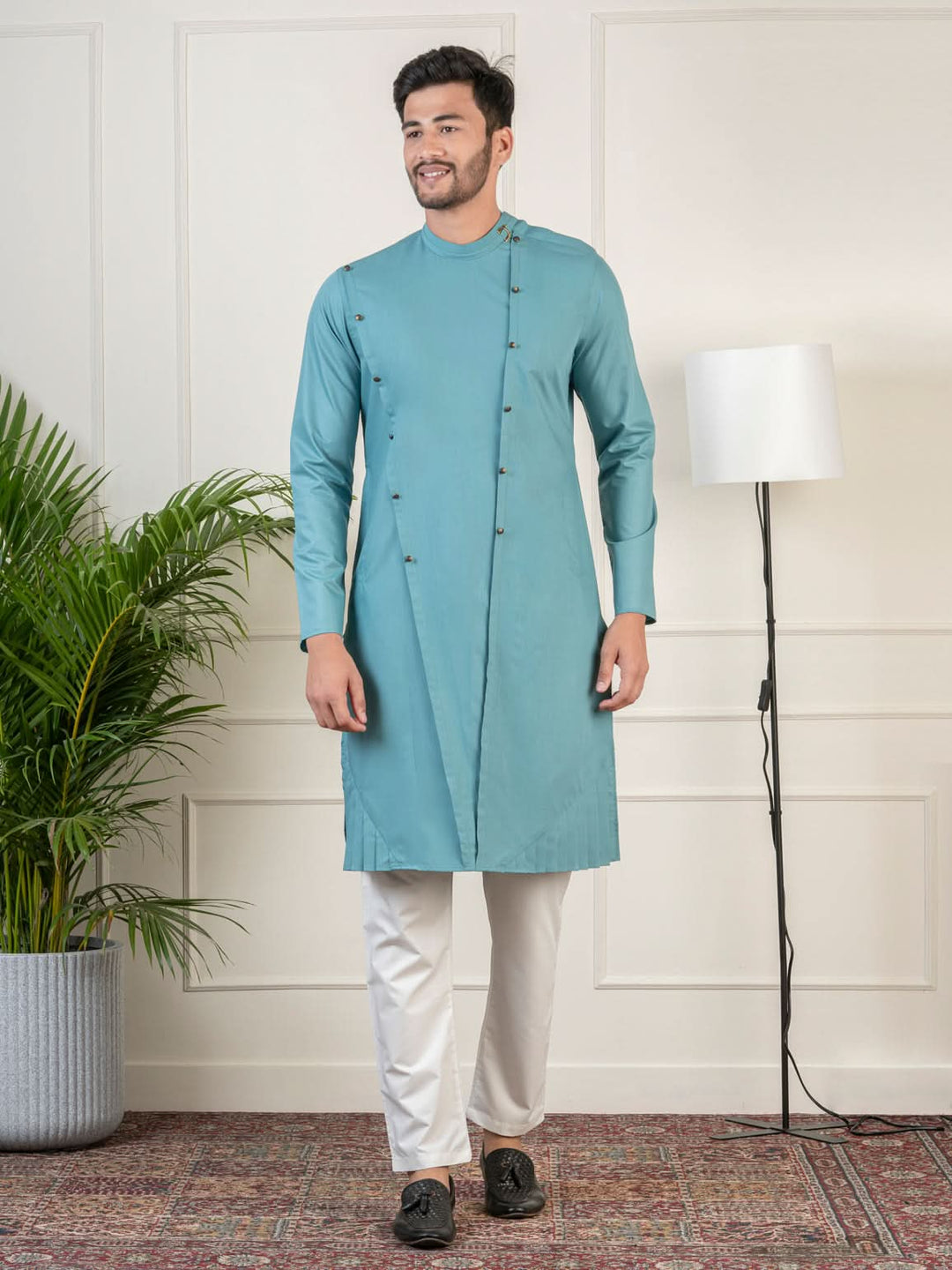 Made from soft and breathable cotton, this Teal Kurta Set from TheEthnic.Co is the perfect blend of comfort and style. With a unique teal color, this set is versatile and can be dressed up or down for any occasion. Elevate your wardrobe with this must-have piece.